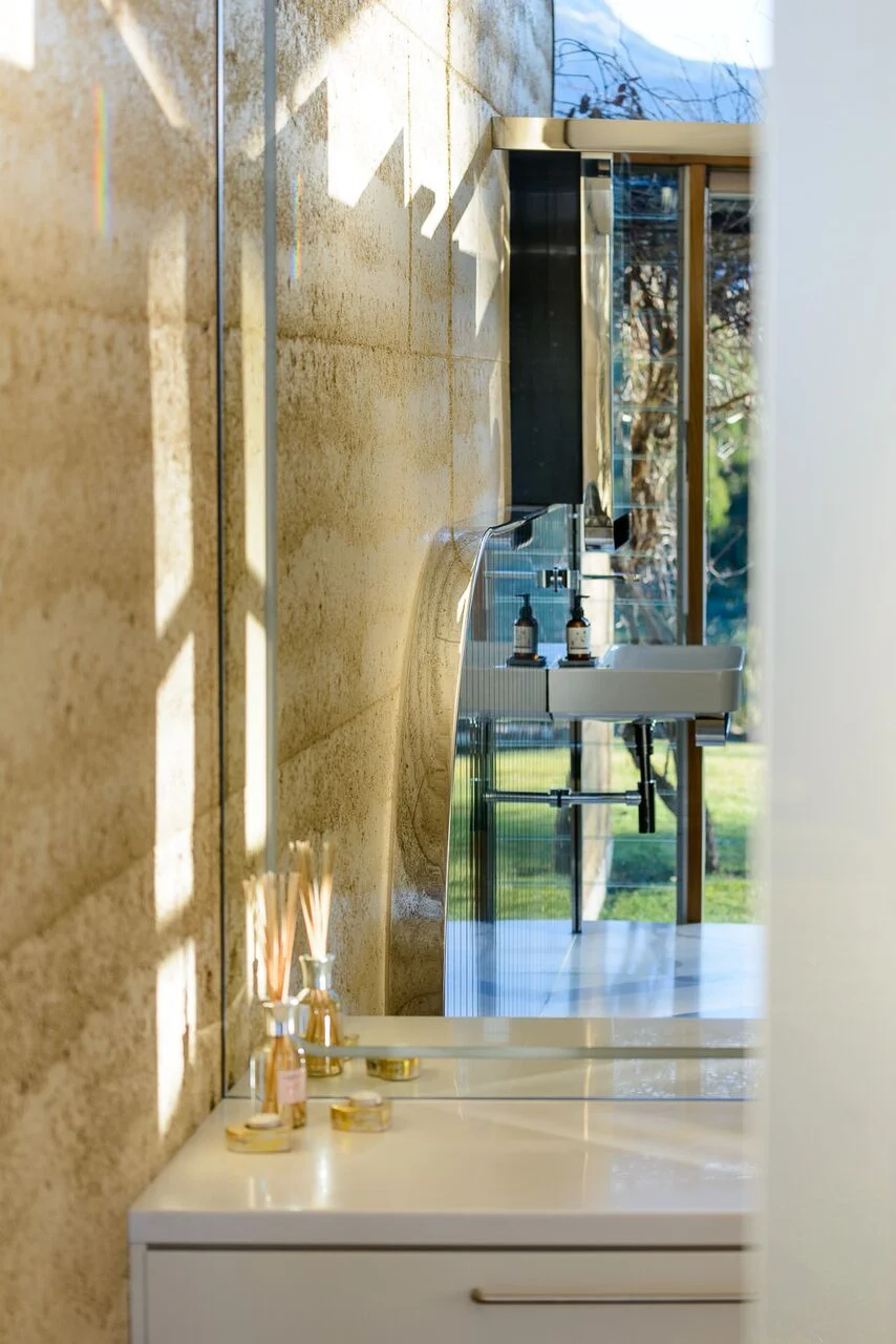European inspired, this ensuite was thoughtfully designed and made with handcrafted materials and stainless steel surrounds throughout. The soft edges of the buffed and polished dado half wall juxtaposed against the roughly textured rammed earth are just few of the many beautiful elements that fill this modern space.