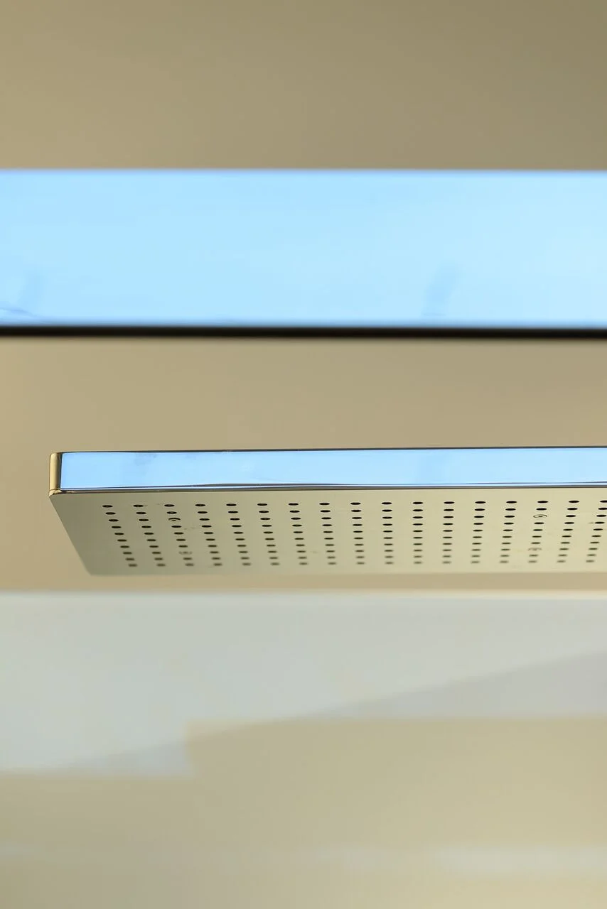 This innovative bathroom boasts everything from Samsung staron walls, natural calcutta stone flooring and gorgeous his and hers storage made from recycled black butt timber, to underfloor heating, high ceilings and super clear glass highlight windows.